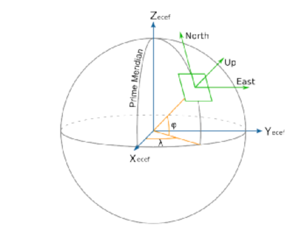 地心为原点,x:坐标点在地球质心到本初子午线(0° 经度)、赤道平面的投影距离(米)y:坐标点在地球质心到东经 90°、赤道平面的投影距离(米)z:坐标点到地球赤道平面的垂直距离(米)